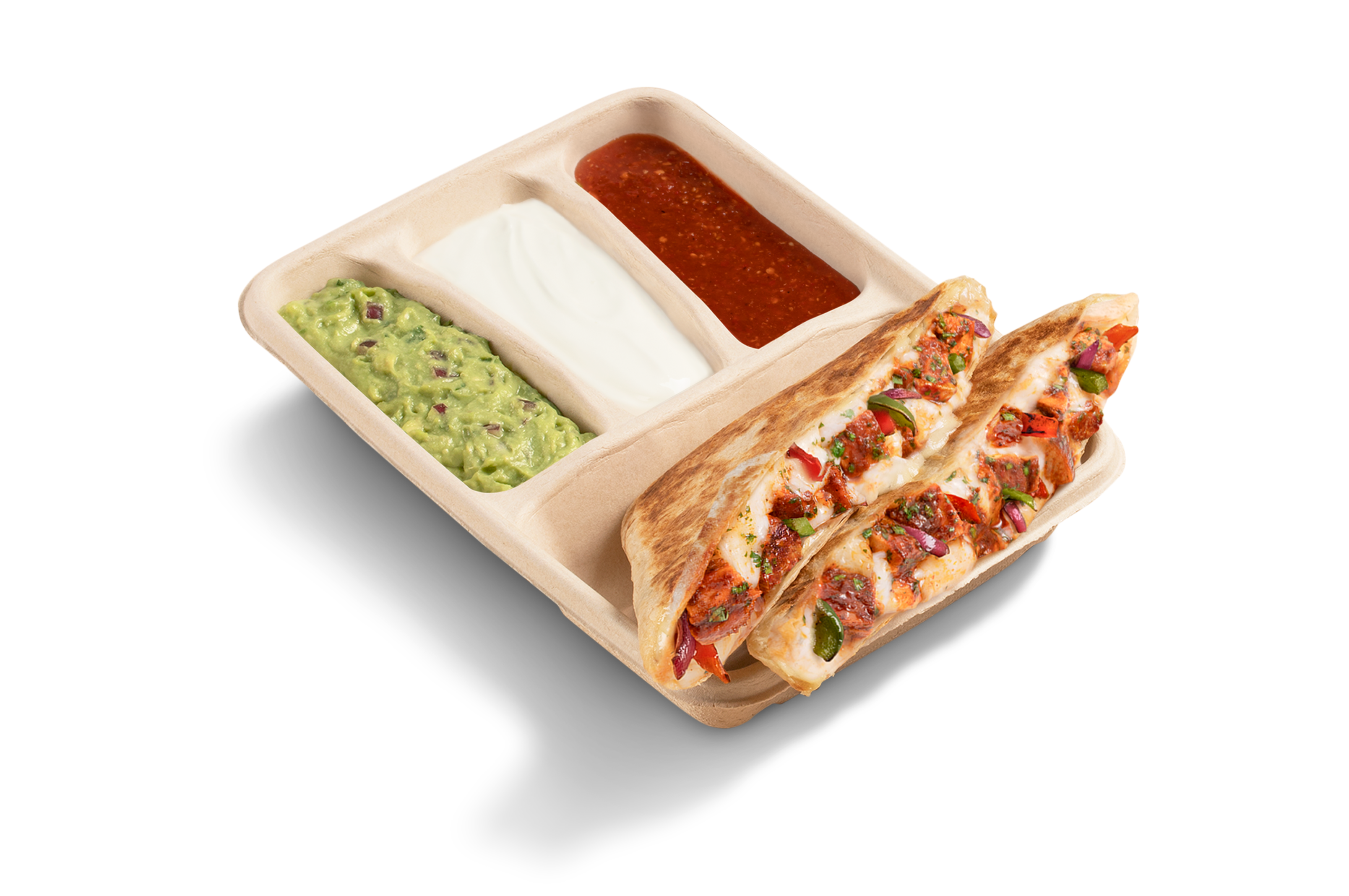 Chicken al Pastor Quesadilla with Fajita Veggies and a side of Guacamole, Sour Cream, and Tomatillo-Red Chili Salsa